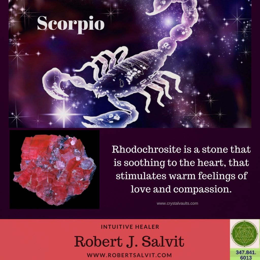 Scorpio symbol with rhodochrosite and healer details.